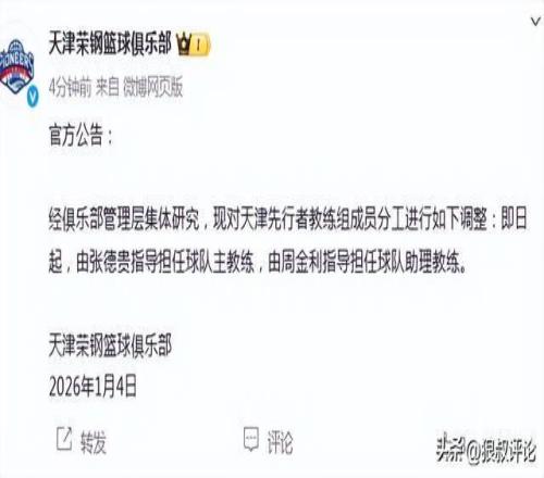 北京時(shí)間1月4日,根據(jù)天津男籃官方社媒的公示,經(jīng)俱樂部管理層集體研究,現(xiàn)對天津先行者教練組成員分工進(jìn)行如下調(diào)整:即日起,由張德貴指導(dǎo)擔(dān)任球隊(duì)主教練,由周金利指導(dǎo)擔(dān)任球隊(duì)助理教練。